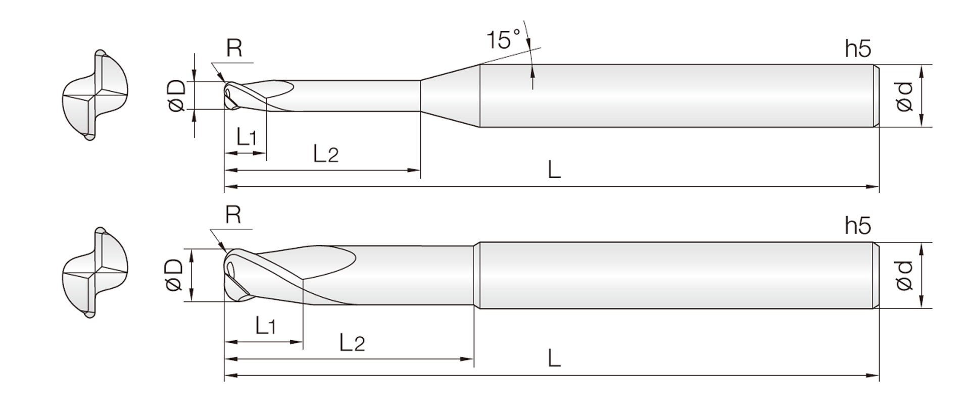 | Image | Part No. | Specifications | Flutes | OD R X D | Length of Cut L1 | Effective Length Leff (mm) | Overall Length L (mm) | Shank Diameter Ds (mm) | Price | Add to Cart |