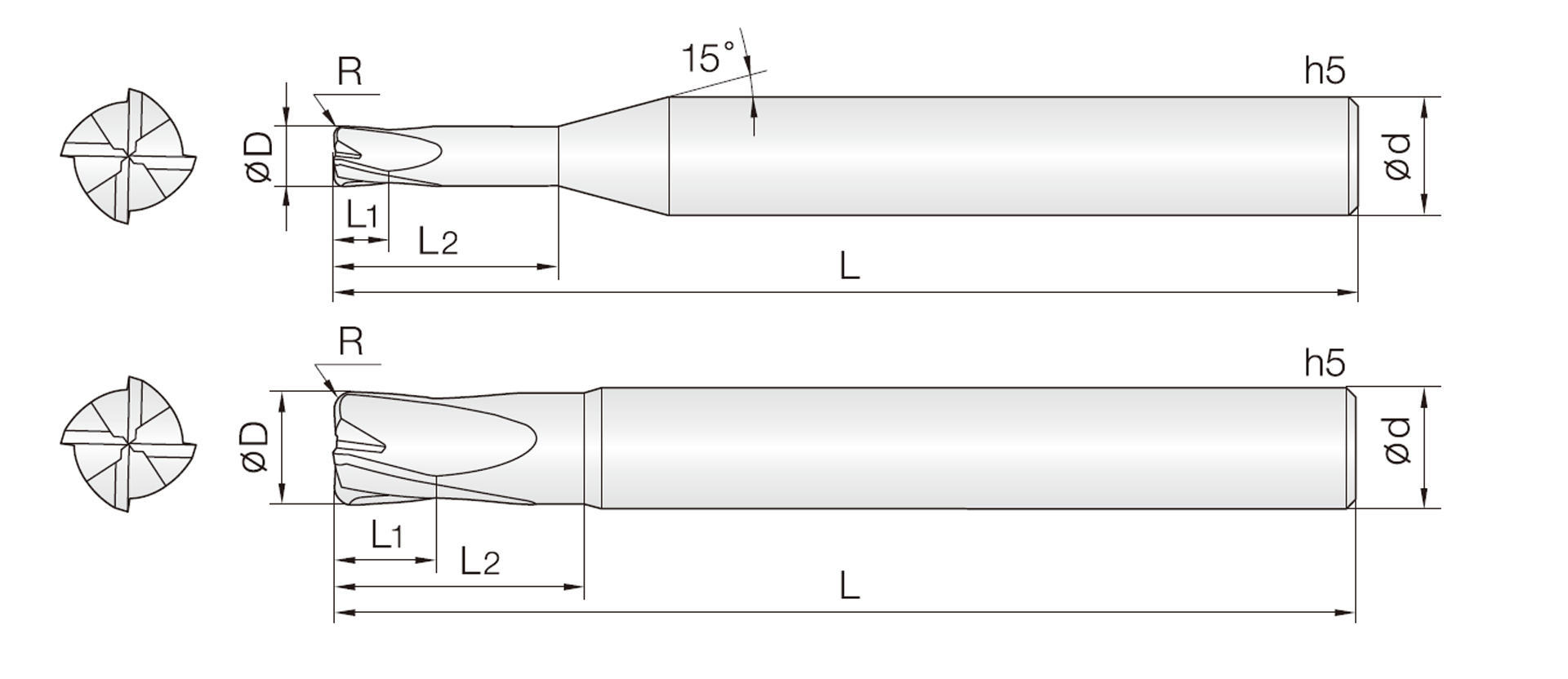 | Image | Part No. | Specifications | Flutes | OD R X D | Length of Cut L1 | Effective Length Leff (mm) | Overall Length L (mm) | Shank Diameter Ds (mm) | Price | Add to Cart |