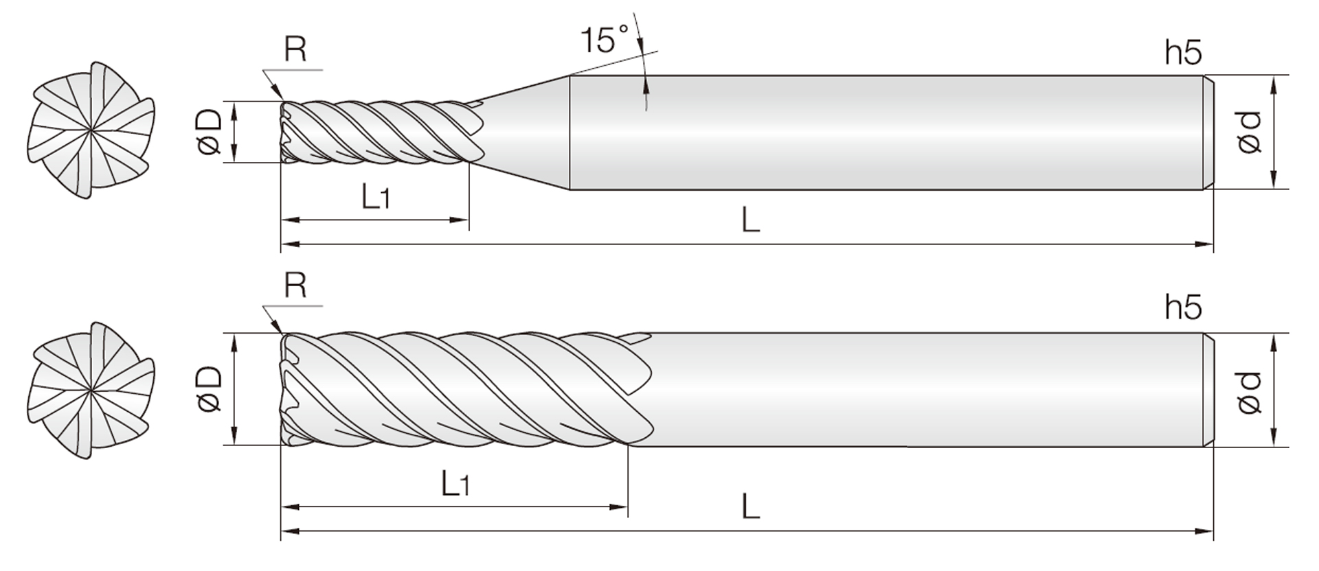 | Image | Part No. | Specifications | Flutes | OD R X D | Length of Cut L1 | Effective Length Leff (mm) | Overall Length L (mm) | Shank Diameter Ds (mm) | Price | Add to Cart |