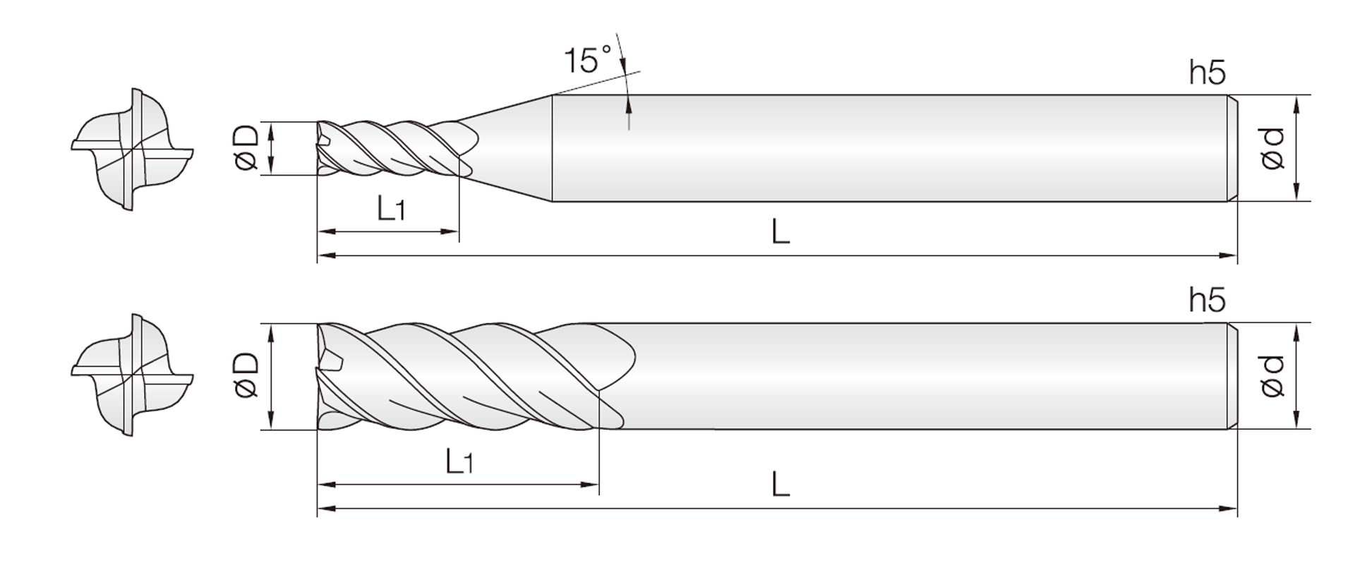 | Image | Part No. | Specifications | Flutes | OD R X D | Length of Cut L1 | Effective Length Leff (mm) | Overall Length L (mm) | Shank Diameter Ds (mm) | Price | Add to Cart |